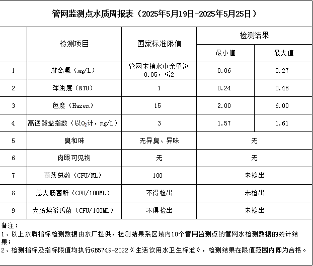 管網監(jiān)測點水質周報表(2025年5月19日-2025年5月25日)