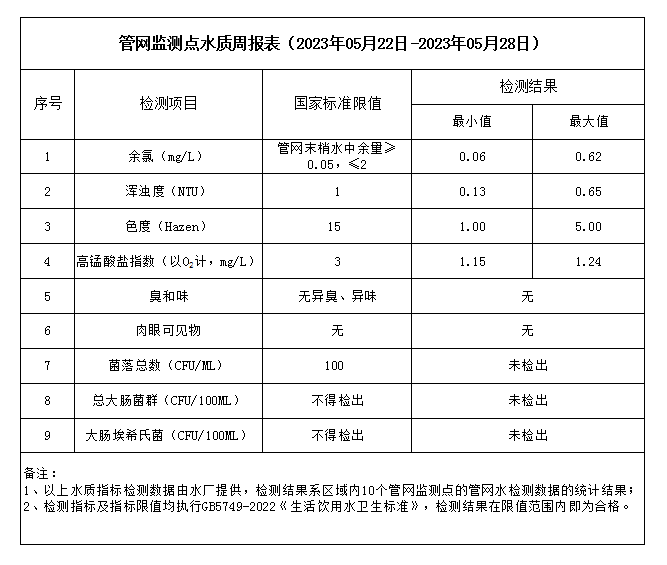 管網(wǎng)監(jiān)測(cè)點(diǎn)水質(zhì)周報(bào)表(2023年05月22日-2023年05月28日)