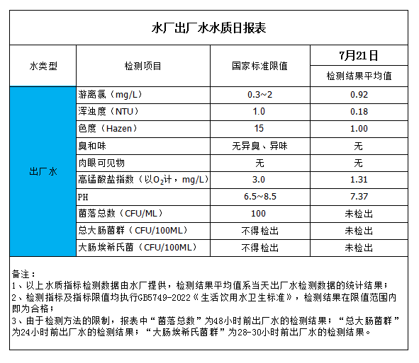 水廠出廠水水質日報表(2023-7-21)