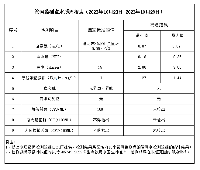 管網監測點水質周報表(2023年10月23日-2023年10月29日)