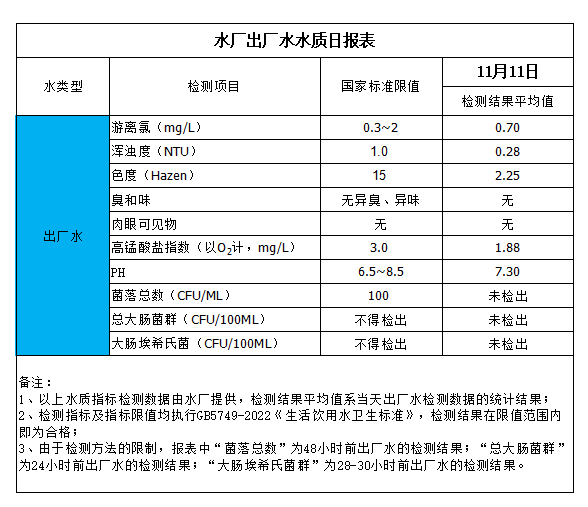 水廠出廠水水質(zhì)日?qǐng)?bào)表(2023-11-11)