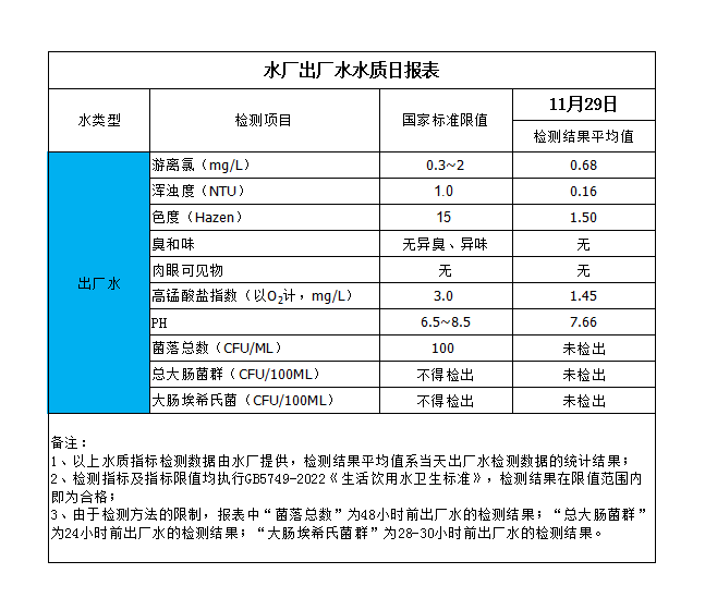 水廠出廠水水質(zhì)日報表(2023-11-29)