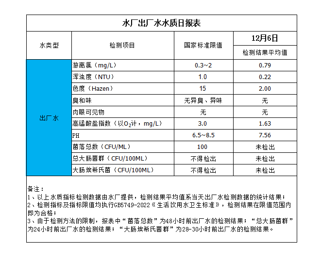 水廠出廠水水質日報表(2023-12-6)