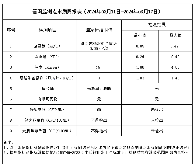 管網監測點水質周報表(2024年03月11日-2024年03月17日)
