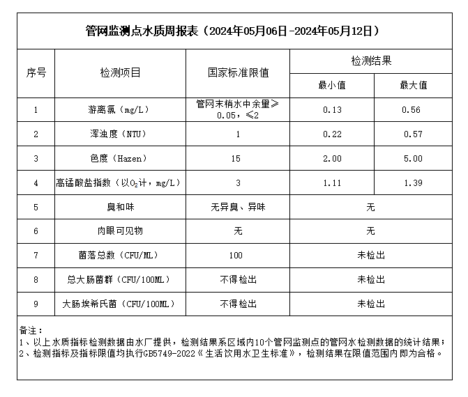 管網(wǎng)監(jiān)測點水質(zhì)周報表(2024年05月06日-2024年05月12日)