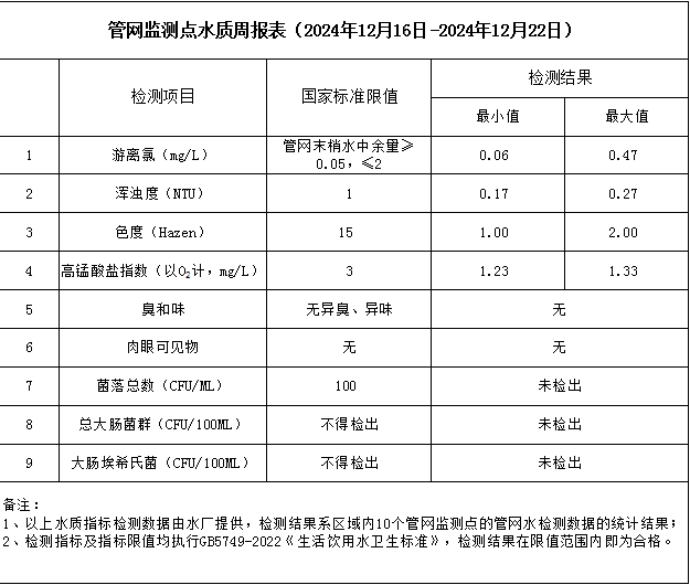管網監測點水質周報表(2024年12月16日-2024年12月22日)