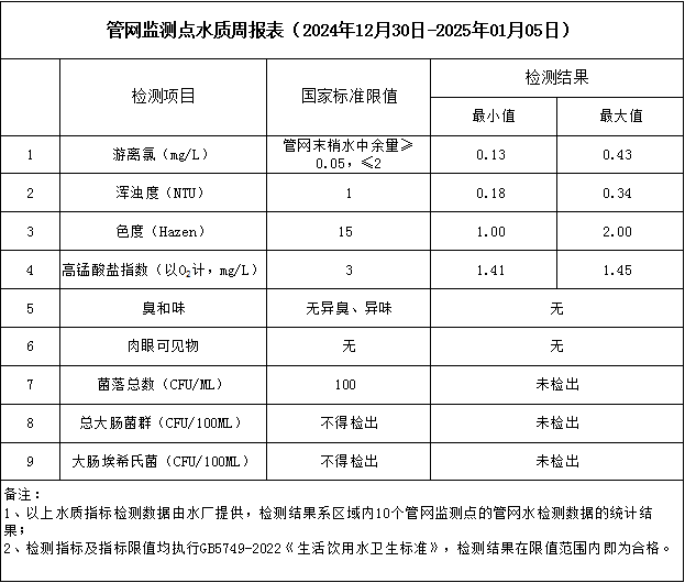 管網監測點水質周報表(2024年12月30日-2025年1月5日)